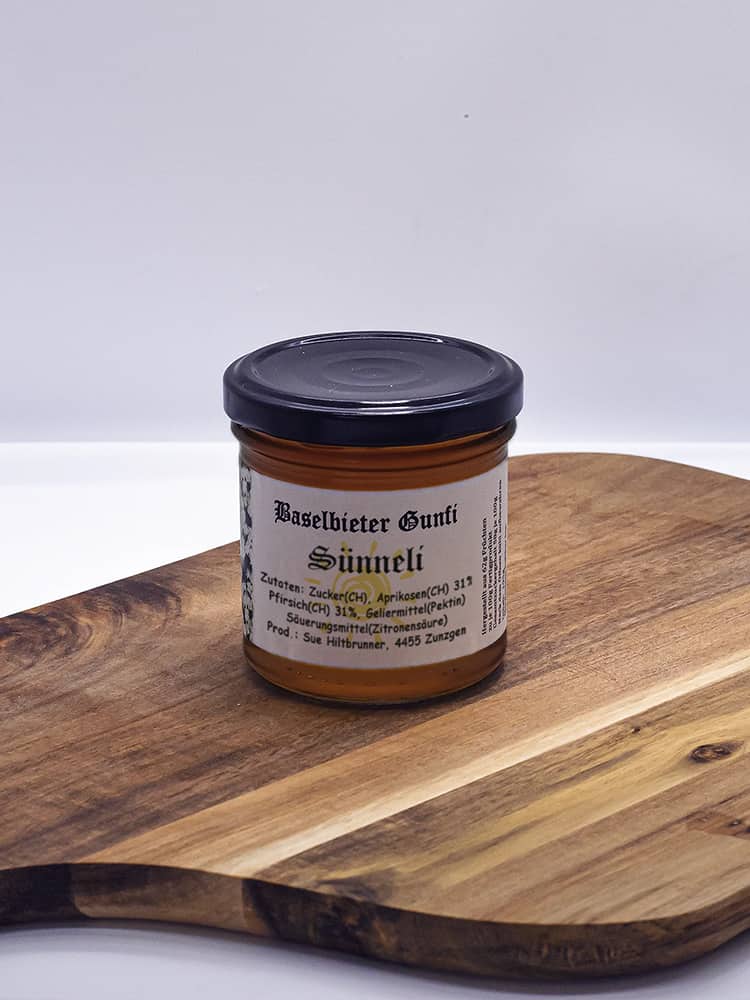 Zutaten: Zucker (CH), Aprikosen (CH), Pfirsiche (CH), Geliermittel (Pektin), Säurungsmittel (Zitronensäure)
