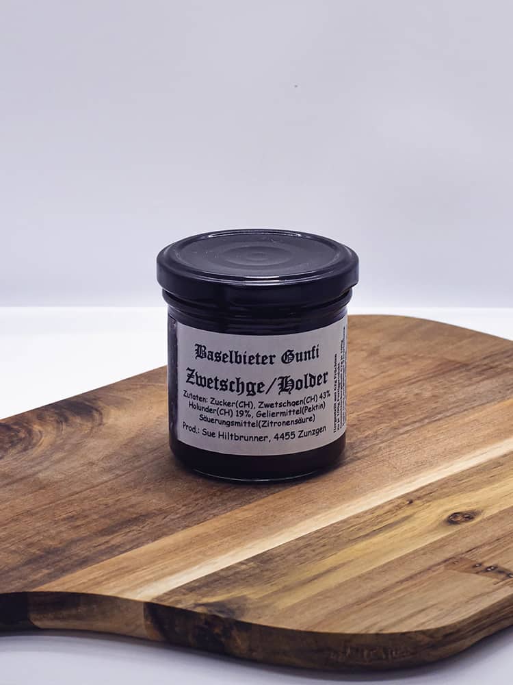 Zutaten: Zucker (CH), Zwetschgen (CH), Holunder (CH), Geliermittel (Pektin), Säurungsmittel (Zitronensäure)